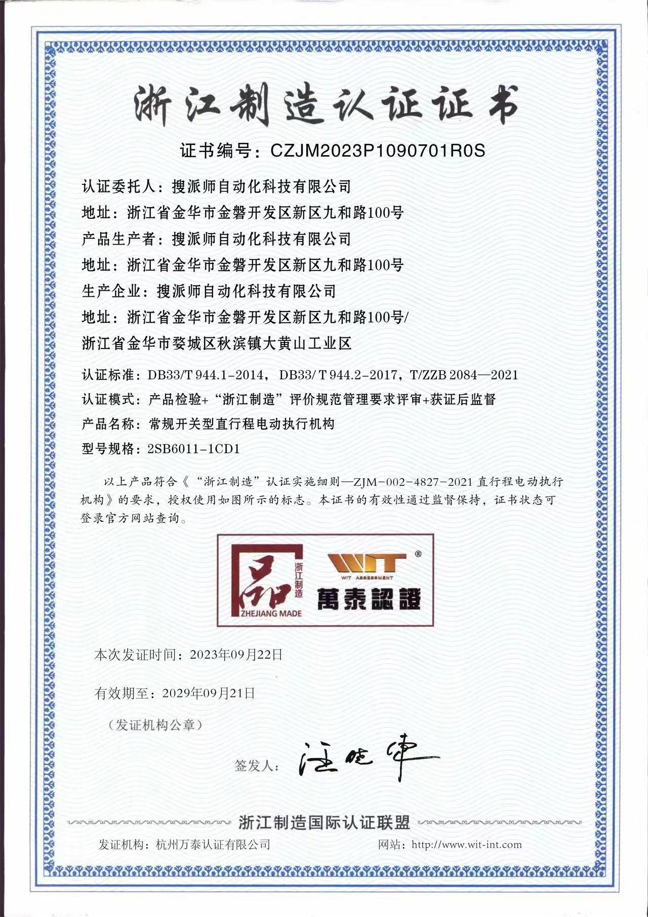 搜派師自動化科技有限公司榮獲浙江制造品字標,標志著公司產品的高品質和卓越表現得到了認可。作為“品字標”品牌的代表,搜派師電動執行器以其精心設計、精良選材、精工制造和精誠服務的特性,為用戶帶來了深度的體驗和卓越的性能。未來,搜派師自動化科技有限公司將繼續不斷創新,不斷提升產品質量和服務水平,努力做好品質之選,為用戶創造更大價值。